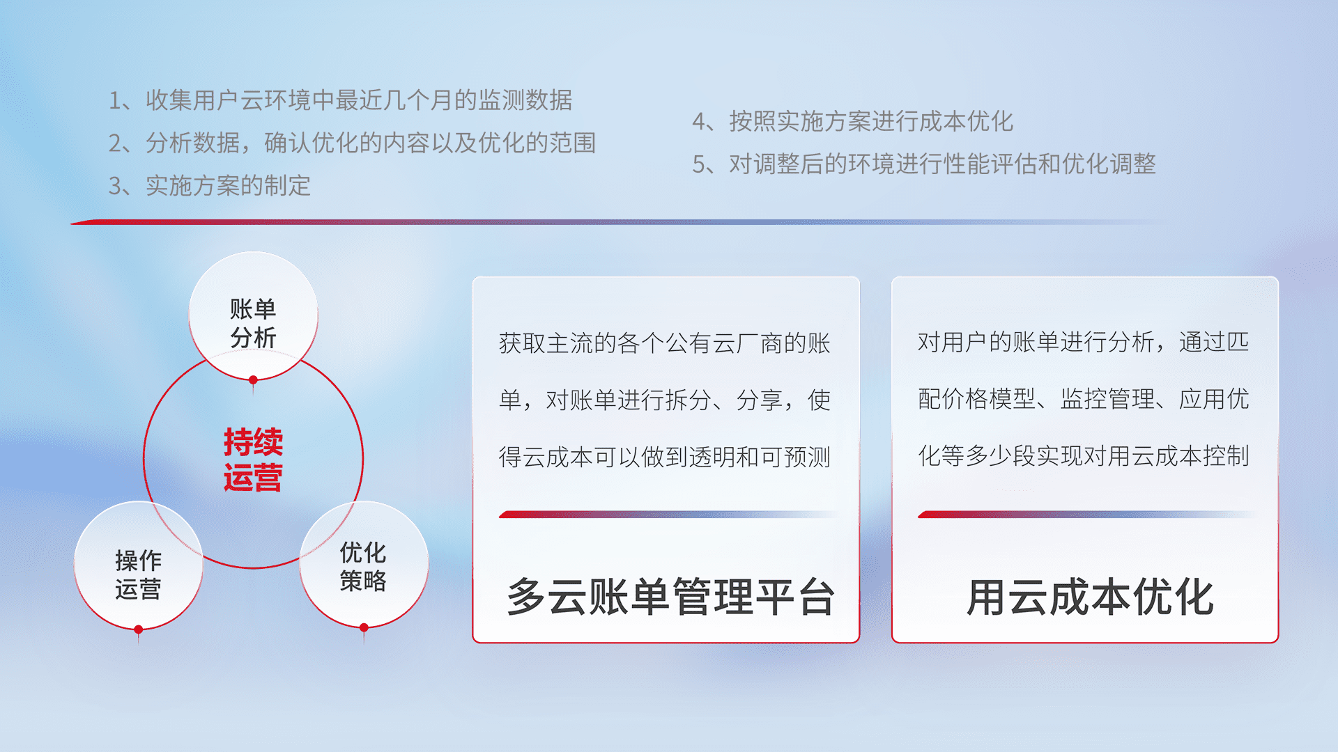 通过多云纳管,,,,以统一的资源数据模型把客户的云资源进行抽象和封装,,,,进而实现对多云资源的统一操作,,,保障云资源管理的可靠性、、稳定性与可用性。。。量身定制化运维内容,,,,配置、、、、开发运维、、、、补丁管理、、备份、、、监控、、认证和访问管理、、审计和日常巡检等,,保障在用云过程中的可靠度,,,,稳定度以及高可用率。。。